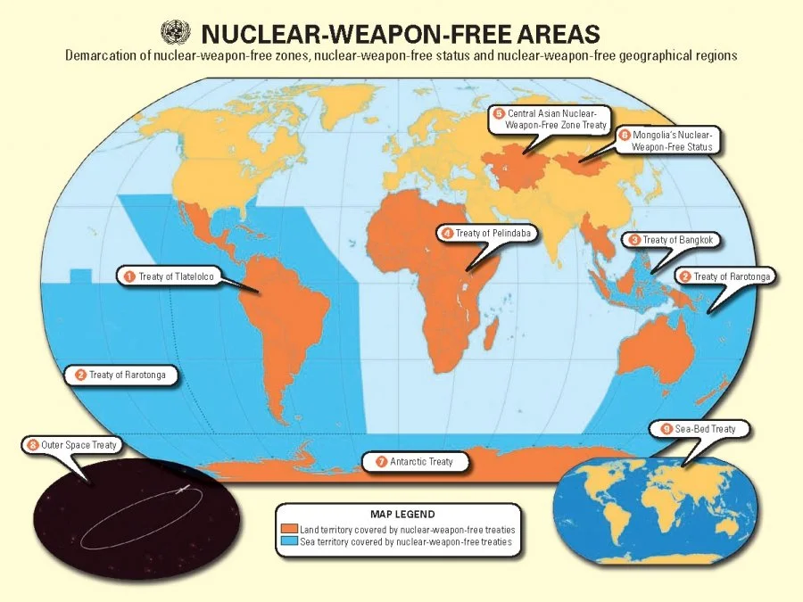 Nuclear-weapon-free zones (NWFZs) are regional agreements where States commit to not having nuclear weapons within their territories, covering aspects like development, manufacturing, possession, and testing.These zones aim to strengthen global nuclear non-proliferation and disarmament efforts. Five major NWFZs exist, covering Latin America, the South Pacific, Southeast Asia, Africa, and Central Asia.